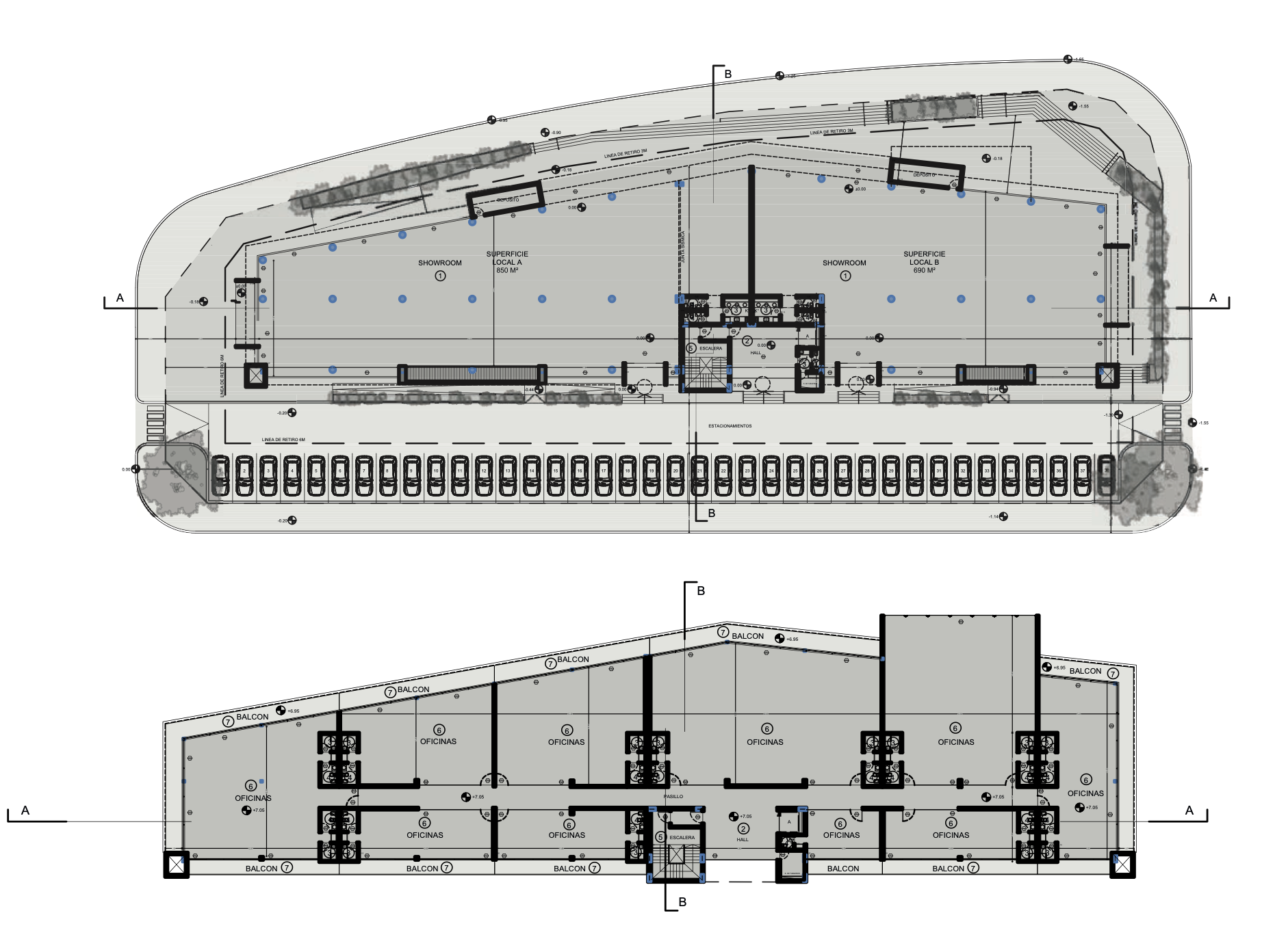 Se desarrolla en dos niveles, en planta baja cuenta con 1.600 m2 destinados para uno o dos locales comerciales en doble altura y totalmente vidriado.